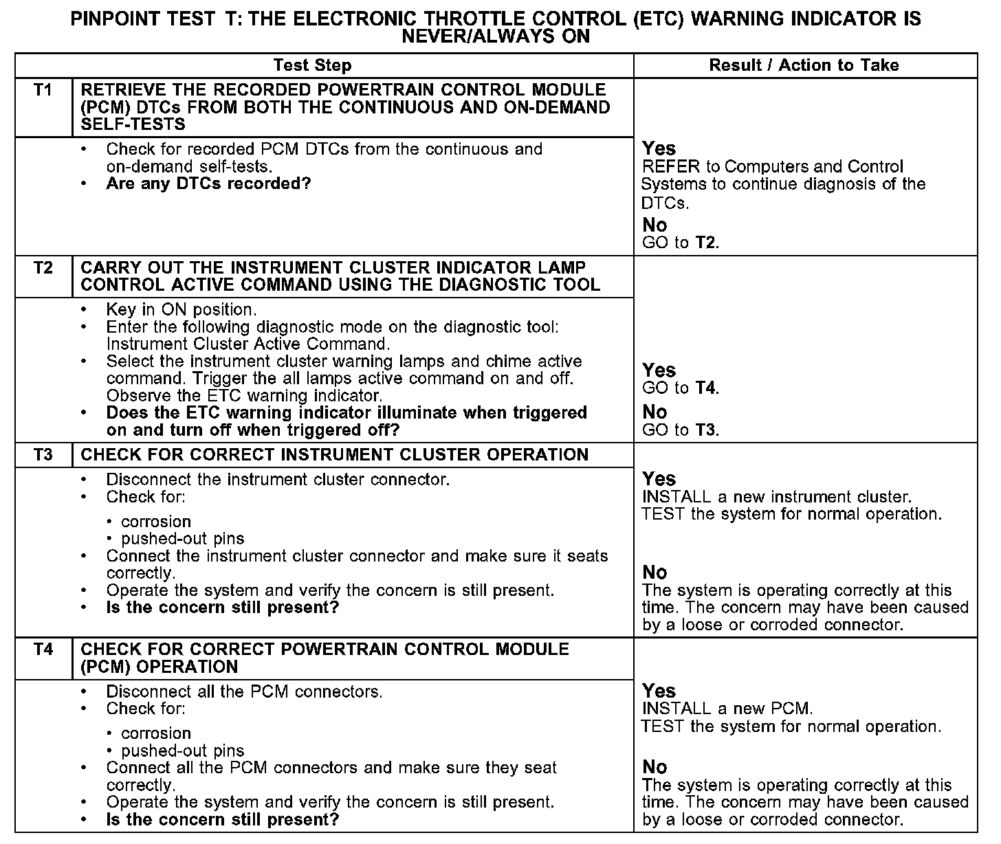 Test T: The Electronic Throttle Control (ETC) Warning Indicator Is Never/Always On