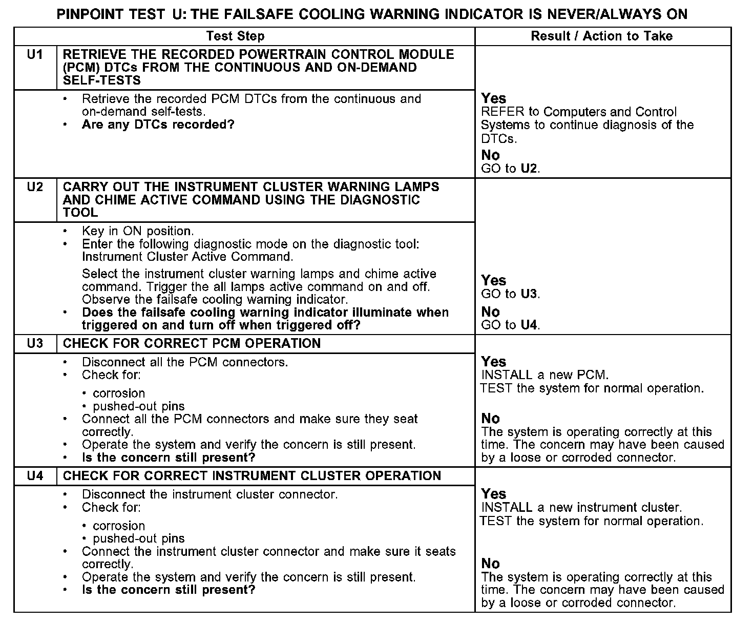 PINPOINT TEST U: THE FAILSAFE COOLING WARNING INDICATOR IS NEVER/ALWAYS ONU1-U4: