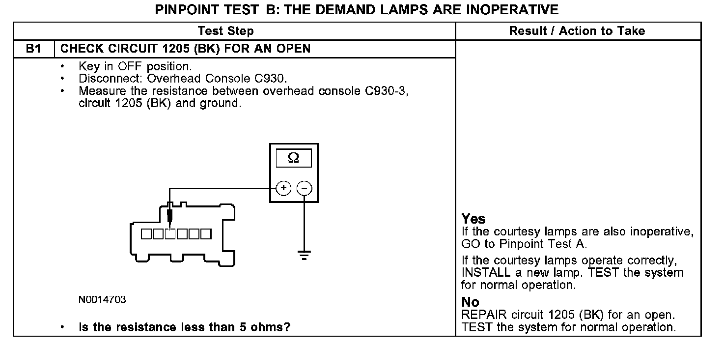Under normal operation, the smart junction box (SJB) turns provides voltage to the demand lamps through circuit 53 (BK/LB). Ground for the demand lamps is provided through circuit 1205 (BK).