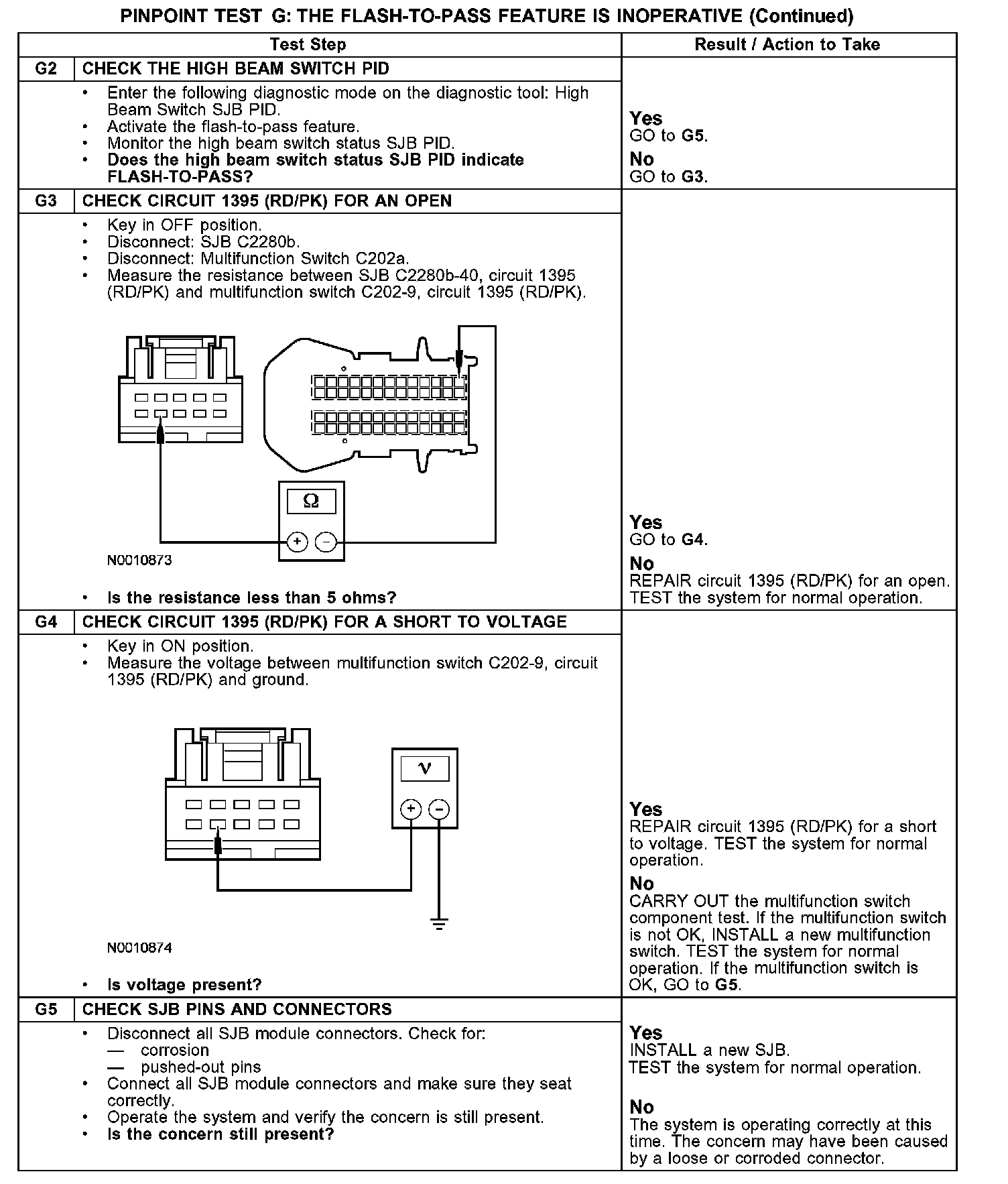 Under normal operation, when the flash-to-pass feature is activated, the multifunction switch provides a ground signal to the SJB through circuit 1395 (RD/PK).