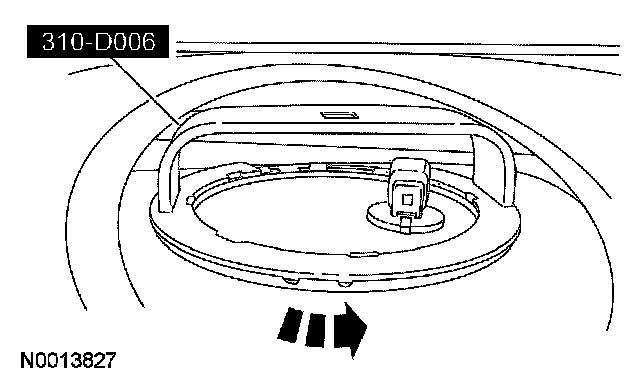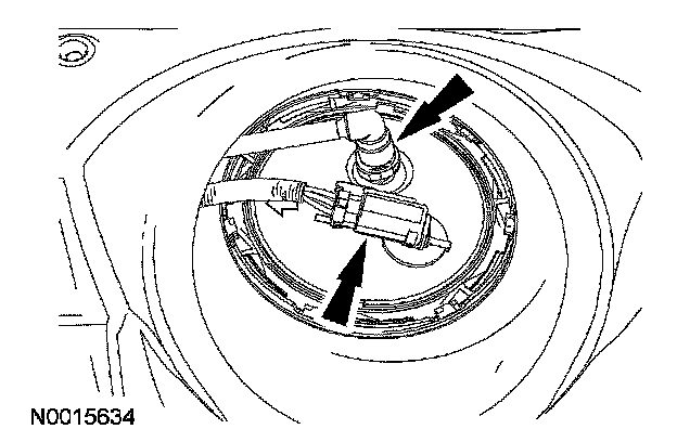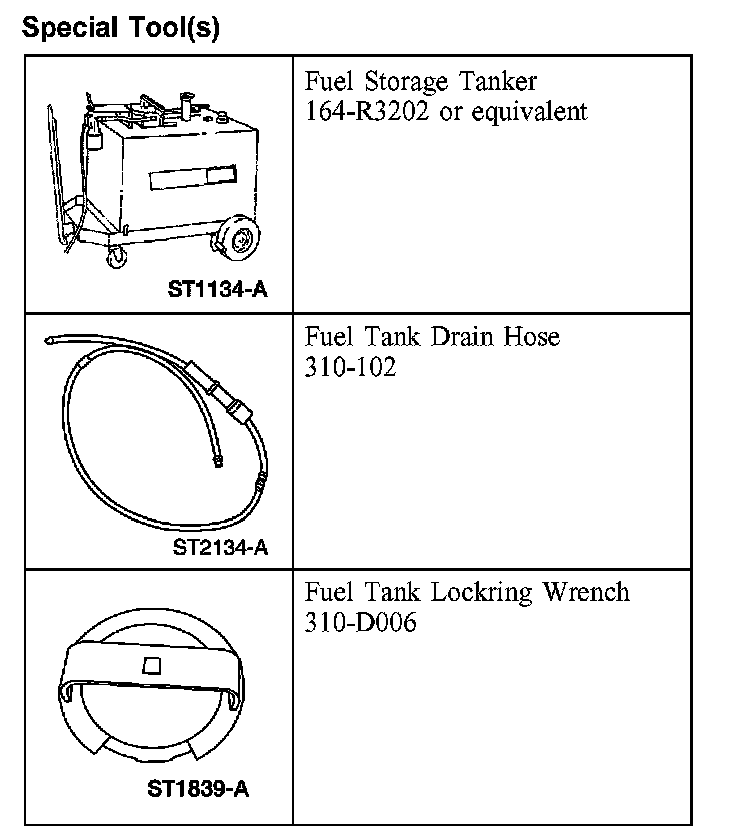 6. CAUTION: The fuel pump (FP) module and the fuel level sensor will be below the fuel level in the tank when the tank is full. Make sure to drain 1/8 of the fuel capacity through the filler pipe prior to removing the FP module or the fuel level sensor or fuel spillage will occur.