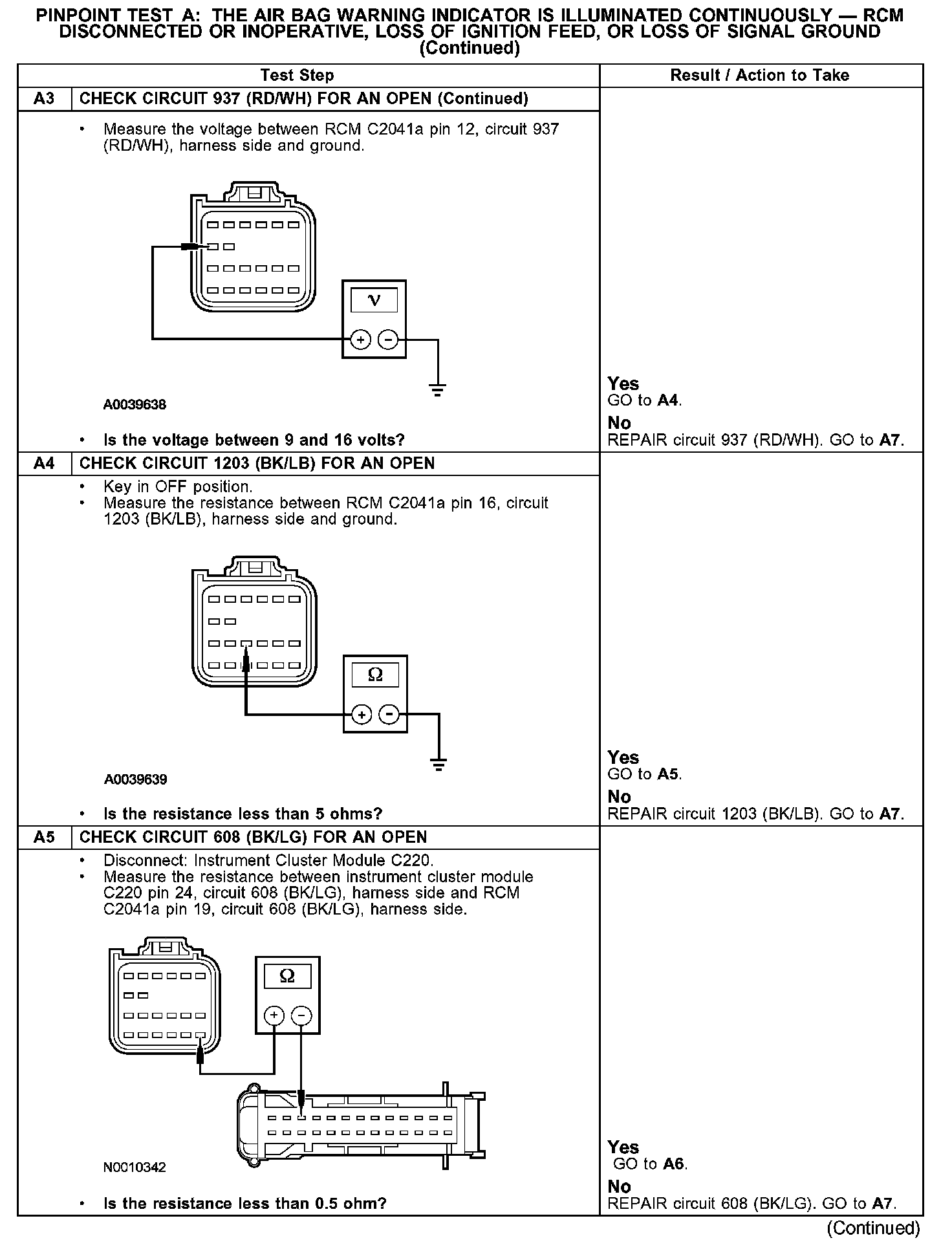 Test A: The Air Bag Warning Indicator Is Illuminated Continuously - RCM Disconnected or Inoperative