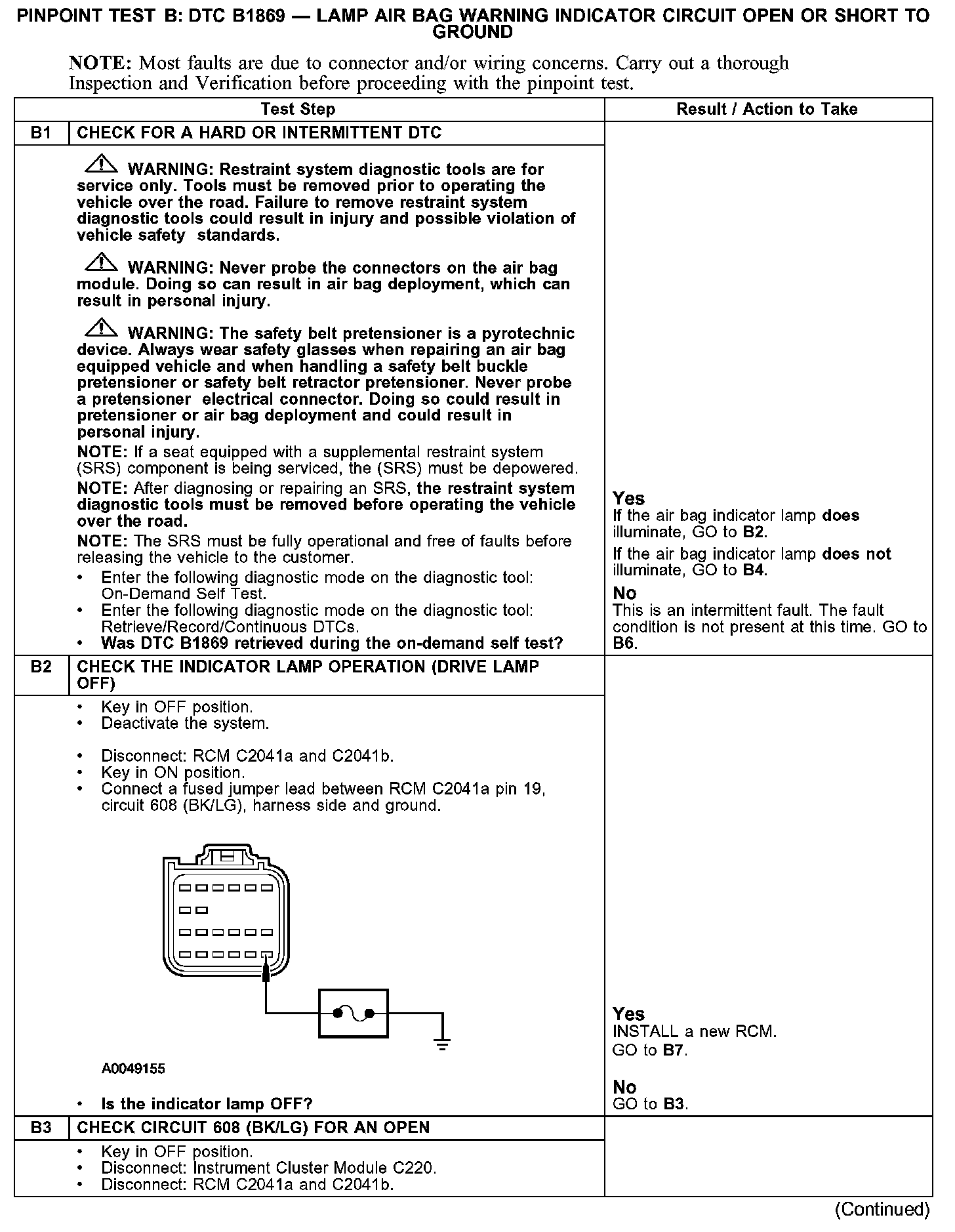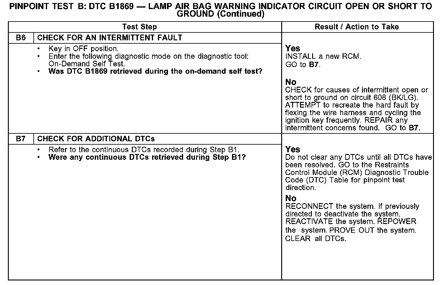 If the restraints control module (RCM) detects an open or short to ground on the air bag warning indicator circuit, it will store diagnostic trouble code (DTC) B1869 in memory.