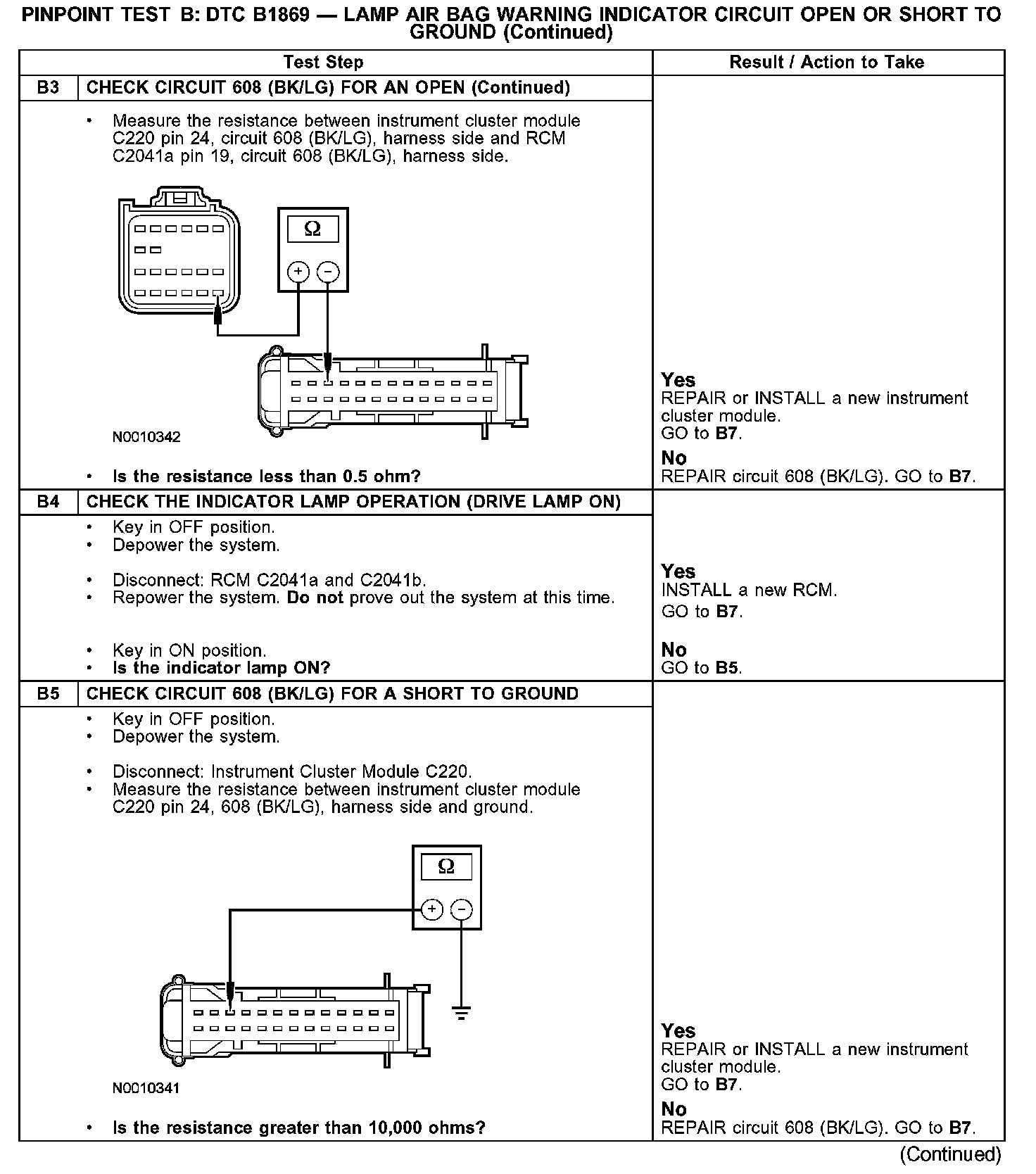PINPOINT TEST B: DTC B1869 - LAMP AIR BAG WARNING INDICATOR CIRCUIT OPEN OR SHORT TO GROUNDB1-B3: