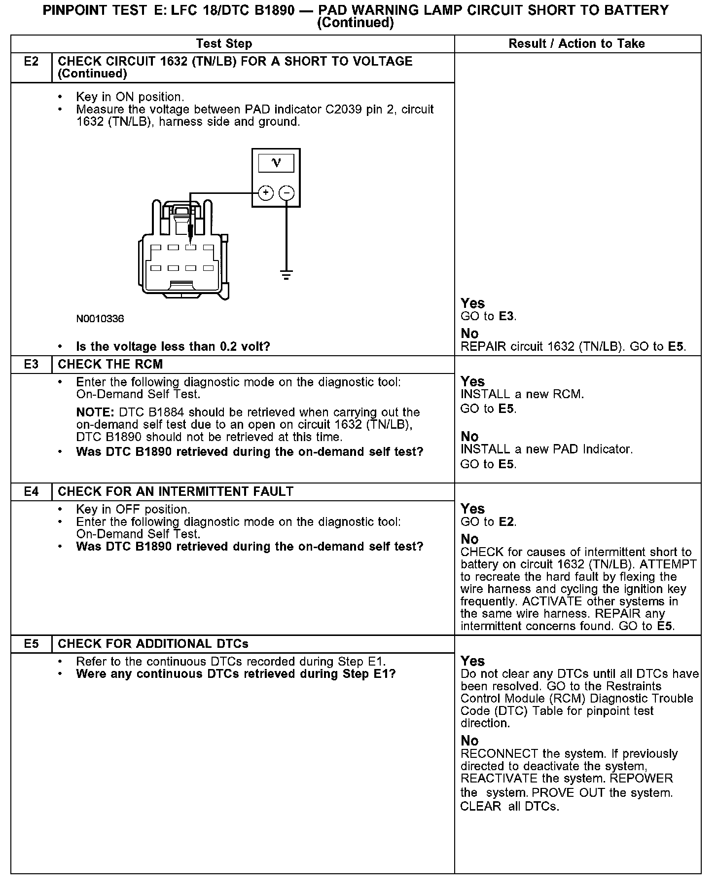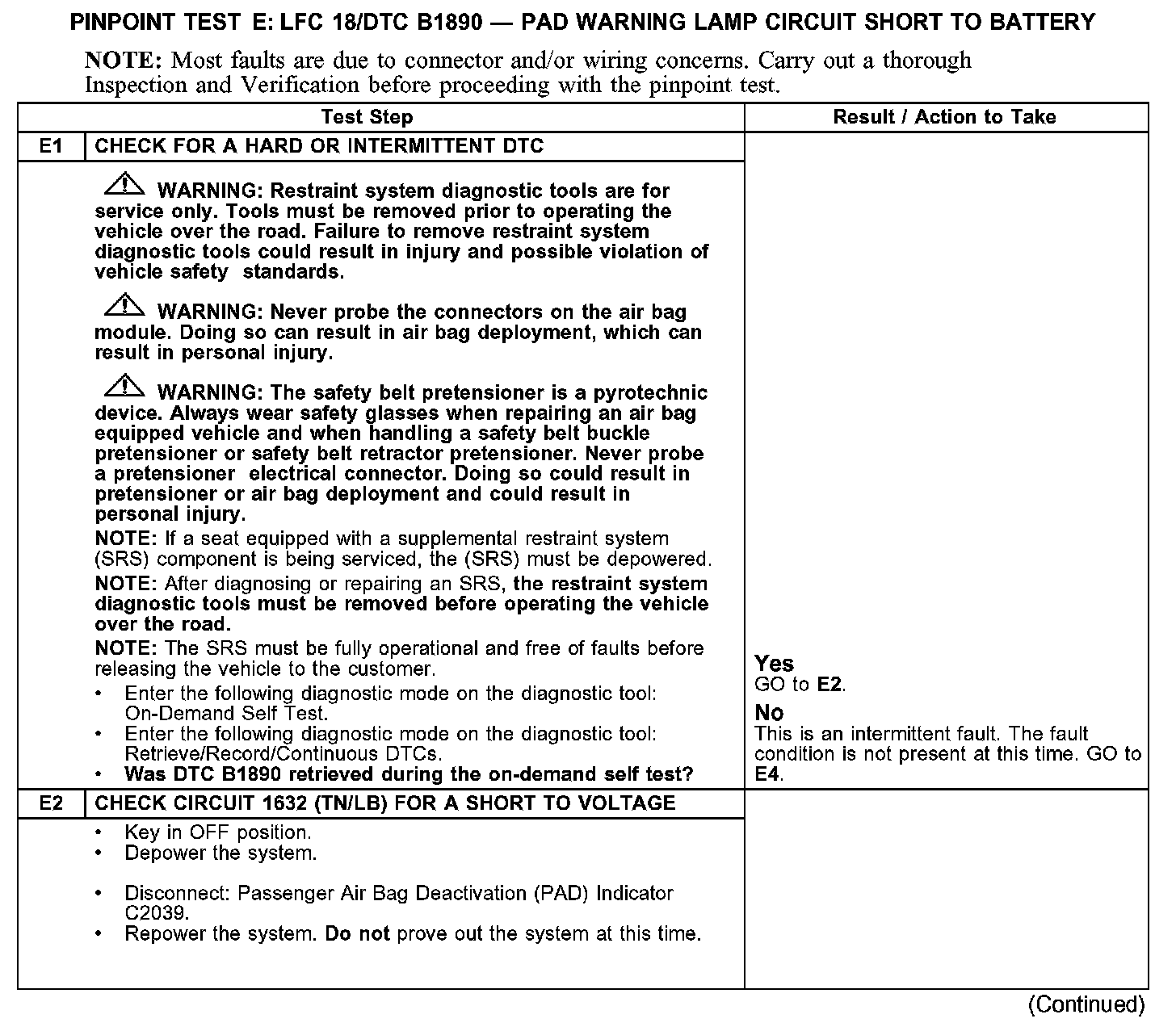 PINPOINT TEST E: LFC18/DTC B1890 - PAD WARNING LAMP CIRCUIT SHORT TO BATTERYE1-E2:
