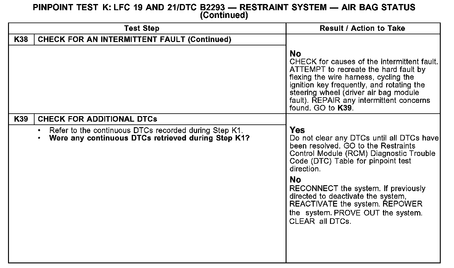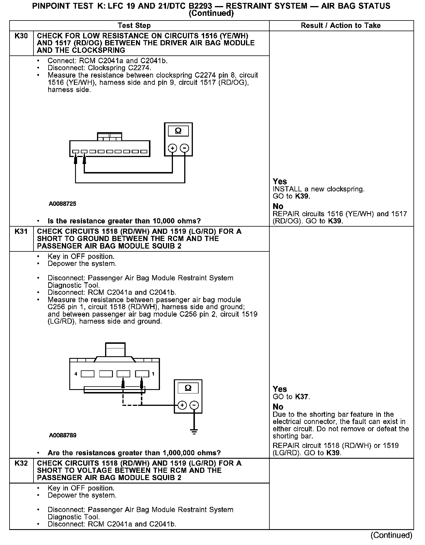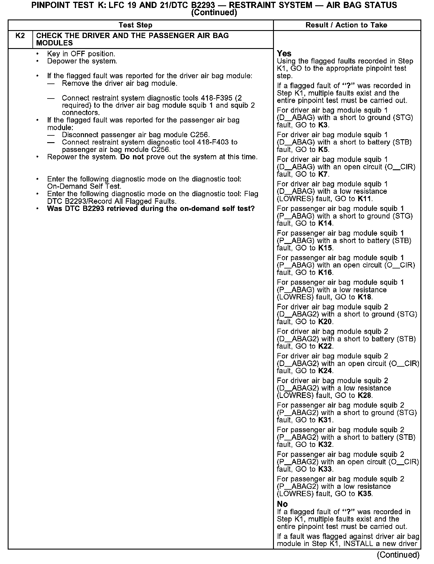 PINPOINT TEST K: LFC 19 AND 21/DTC B2293 - RESTRAINT SYSTEM - AIR BAG STATUSK1: