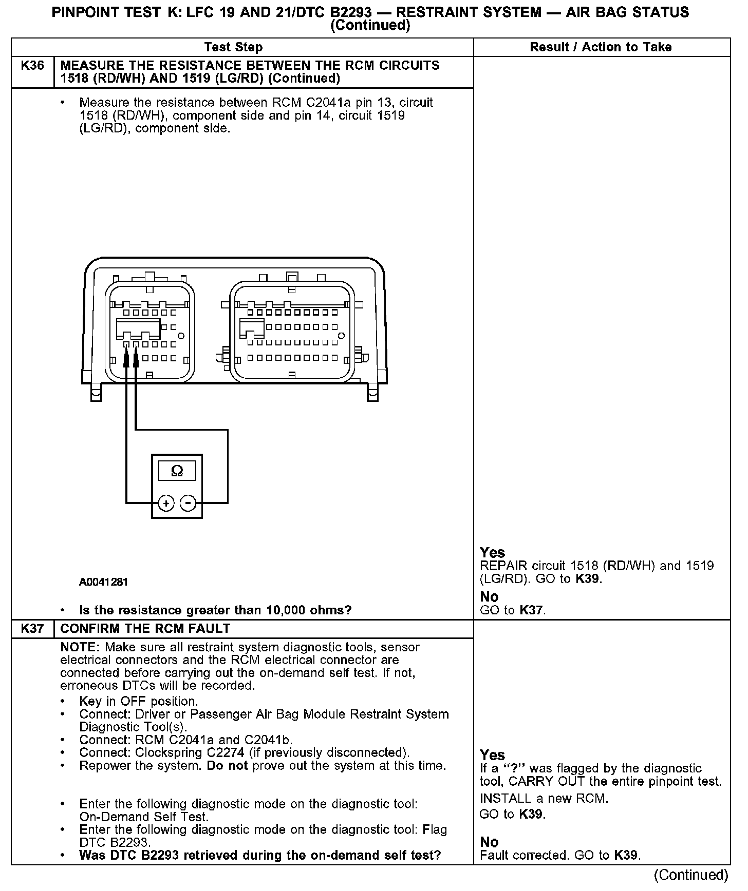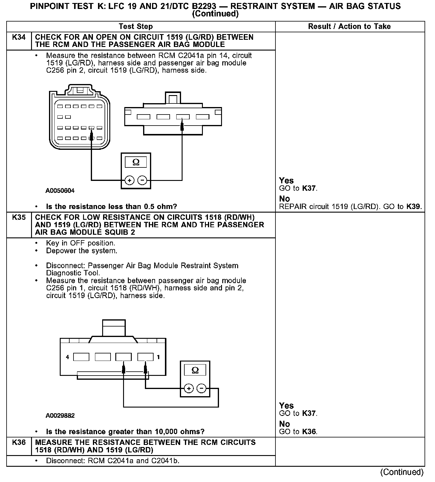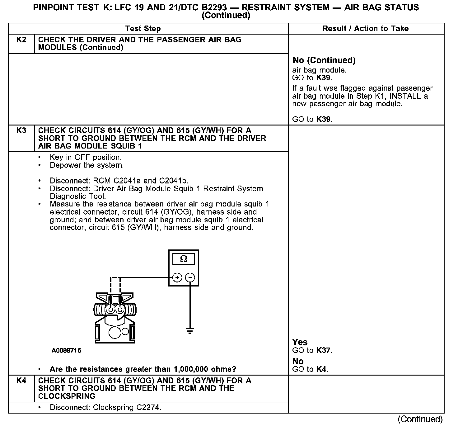 PINPOINT TEST K: LFC 19 AND 21/DTC B2293 - RESTRAINT SYSTEM - AIR BAG STATUSK1: