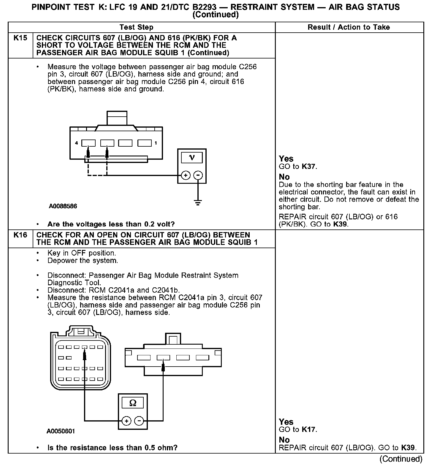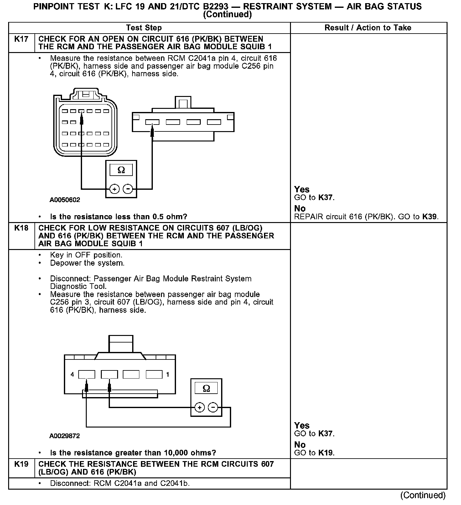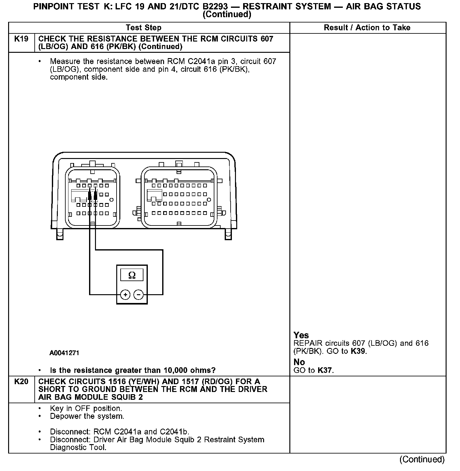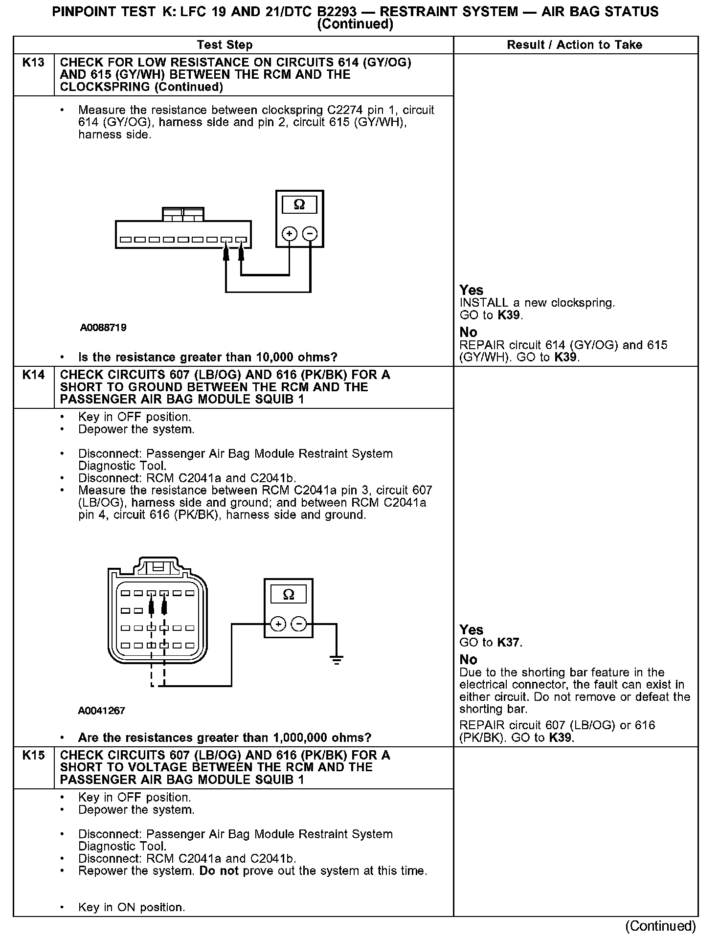 Test K: LFC 19 and 21/DTC B2293 - Restraint System - Air Bag Status