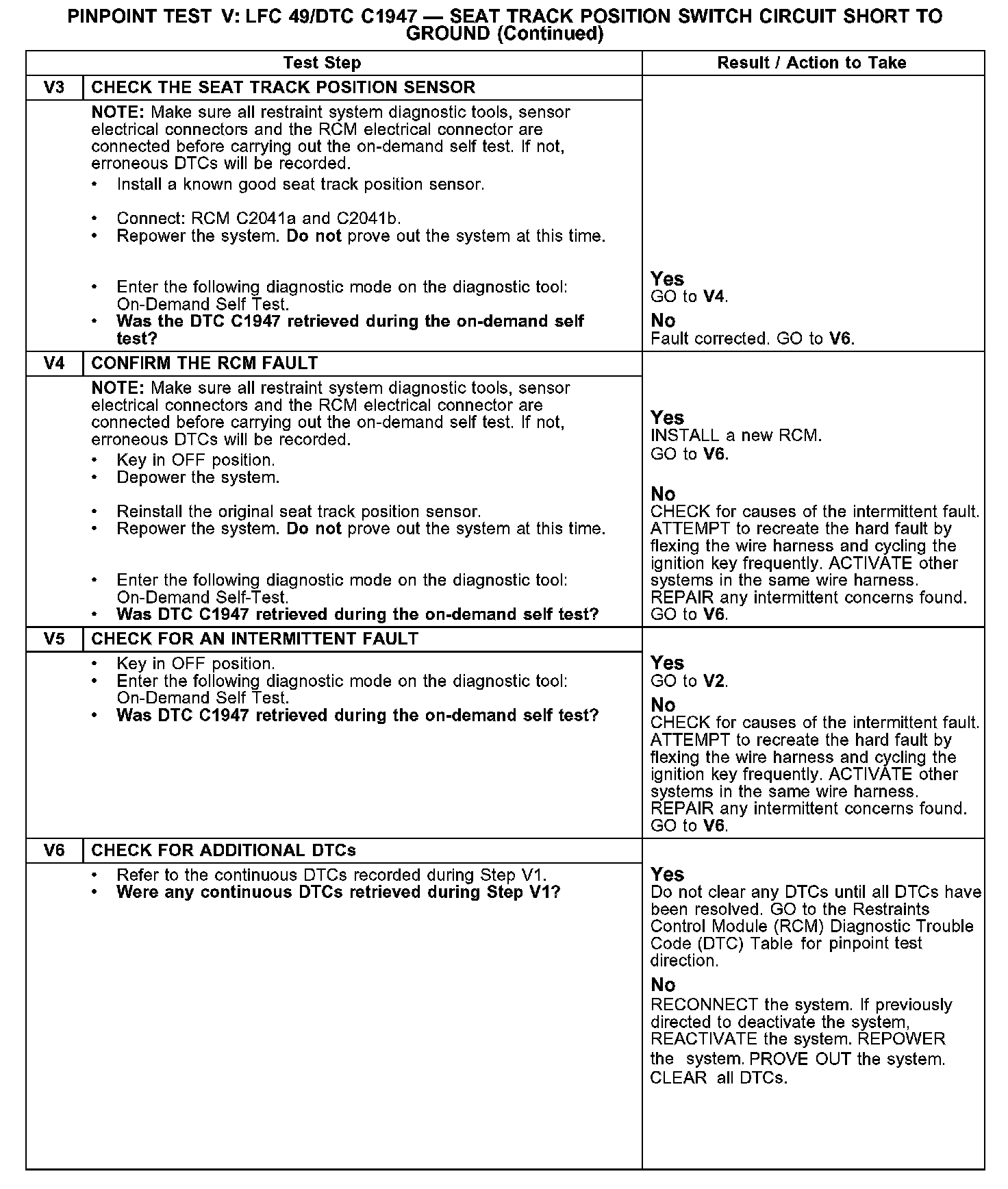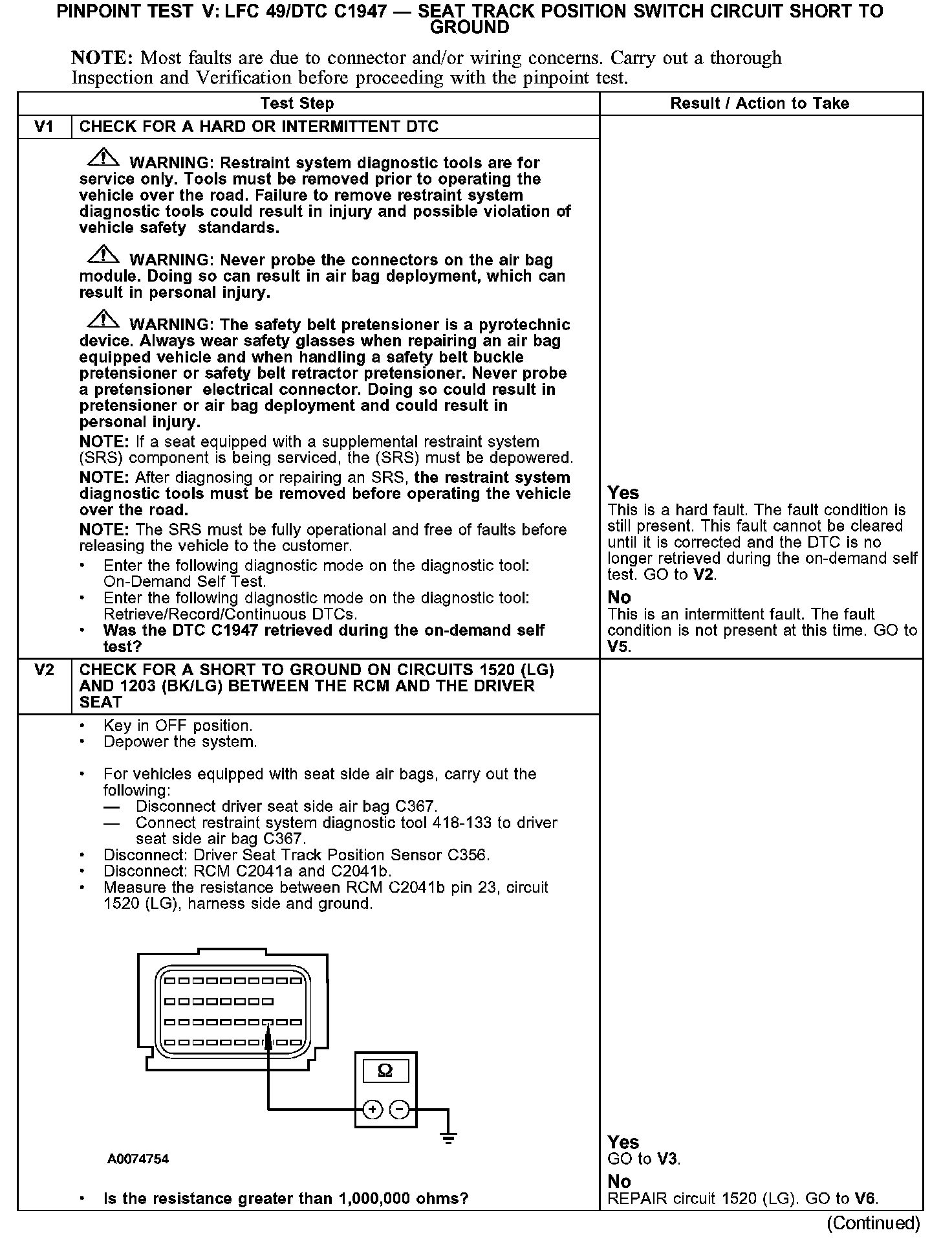 PINPOINT TEST V: LFC 49/DTC C1947 - SEAT TRACK POSITION SWITCH CIRCUIT SHORT TO GROUNDV1-V2: