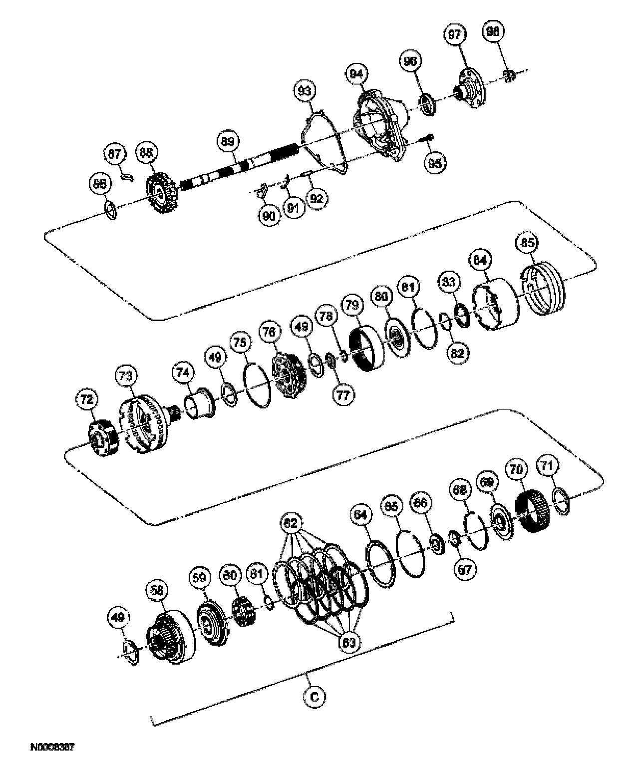 35. Remove the overdrive ring gear, overdrive one-way clutch assembly and center shaft as an assembly.