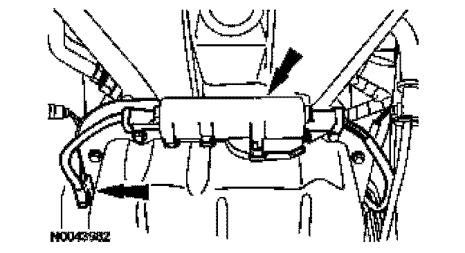 2. Remove the heated oxygen sensor connectors from the front of the transmission pan rail and disconnect the wire retaining clip from the right side of the transmission pan rail.