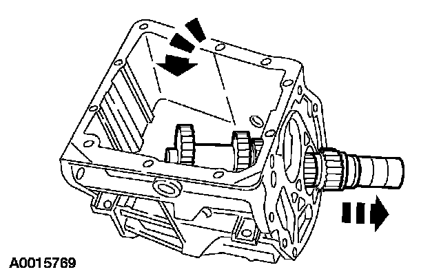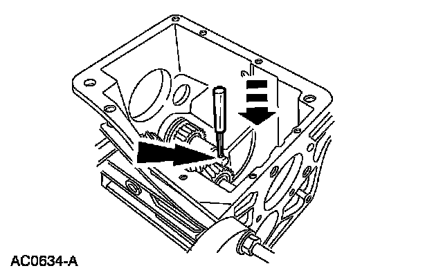 ^ Place the reverse idler gear and bushing into the NEUTRAL position. Align the reverse shift fork and the reverse idler gear and bushing. Push downward on the reverse shift fork until fully engaged into the reverse idler gear and bushing.