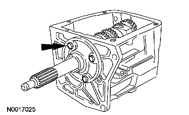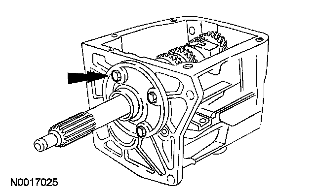 NOTE: Select a shim with a thickness equal to the dial indicator reading. This will provide zero end play. Rotate the transmission to the horizontal position and remove the input shaft bearing retainer. Remove the bearing race and install the necessary shim(s).