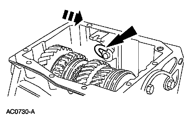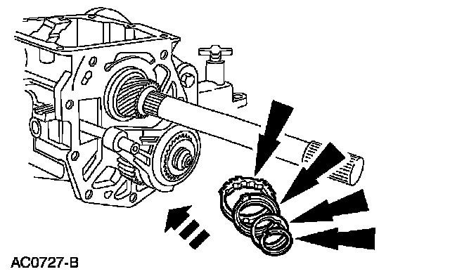 Install the synchronizer blocking ring, the reverse brake ring, the thrust washer and the 5th speed synchronizer retaining snap ring.