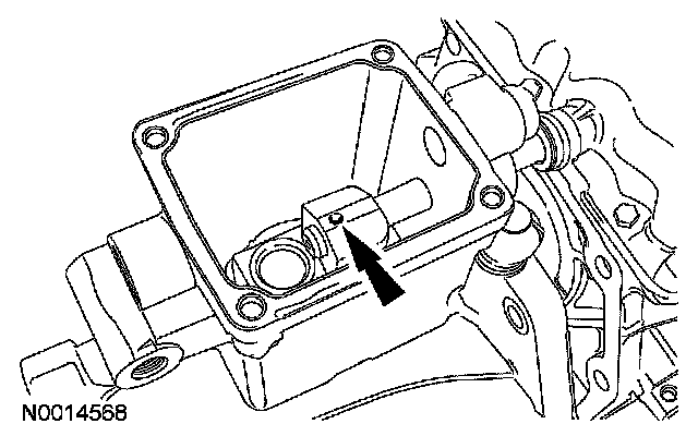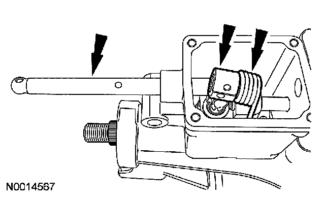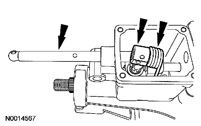 ^ Align the ball stud with the slot in the case and align the reverse gear shift rail with the reverse shift fork. Once the ball stud enters the case, rotate the reverse gear shift rail until the ball aligns with the reverse gearshift lever. Rotate the reverse gear shift rail counterclockwise until the ball stud fully engages the reverse gearshift lever.