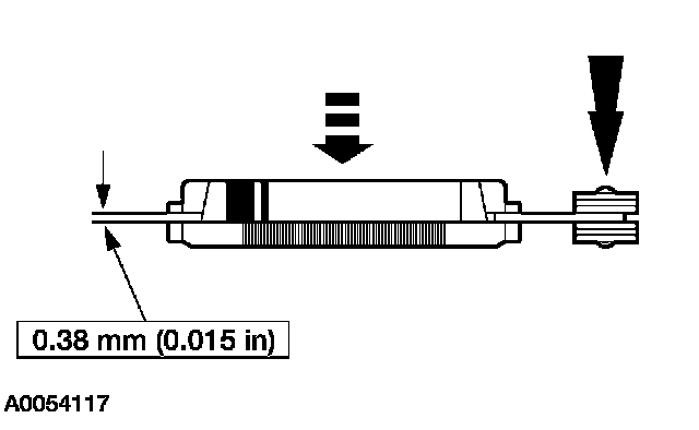 ^ Insert a feeler gauge and measure the clearance, while applying pressure and rotating the blocking ring. The measurement should be the same around the entire circumference. If the clearance is less than 0.38 mm (0.015 inch), install new blocking rings.