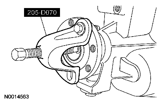 6. Remove the output shaft flange nut. Using the special tool, remove the output shaft flange, the washer and the seal. Discard the seal.