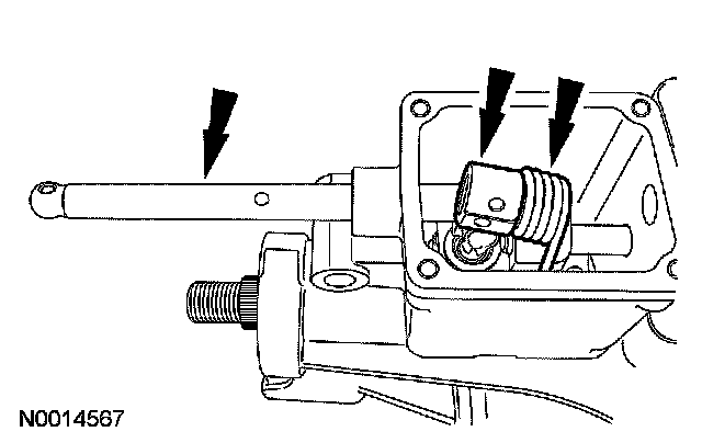 ^ Rotate the reverse gear shift rail clockwise to disengage the ball stud from the reverse gearshift lever. Pull the reverse gear shift rail rearward slightly. Rotate the reverse gear shift rail counterclockwise to align the ball stud with the slot in the case and remove the reverse gear shift rail.