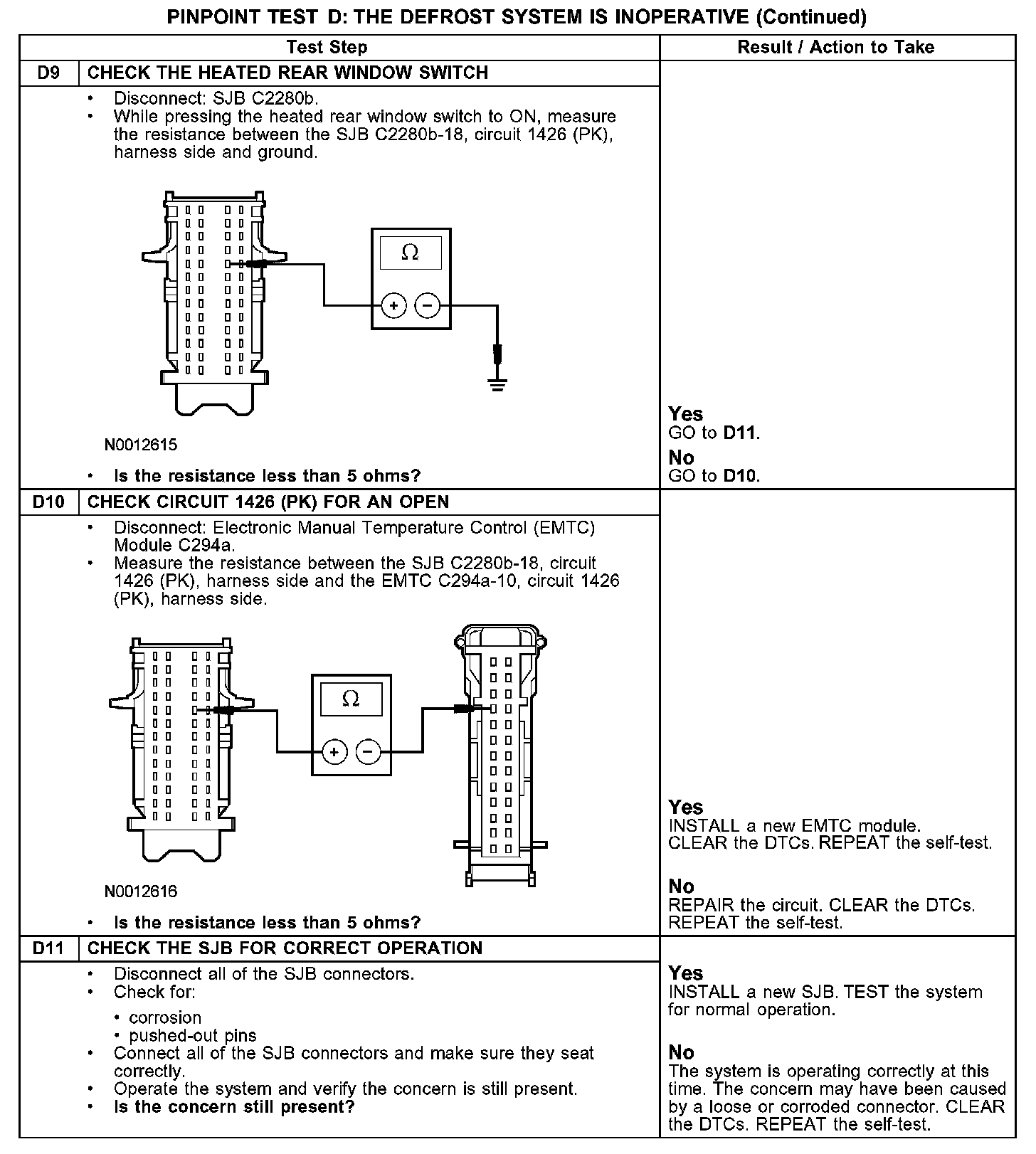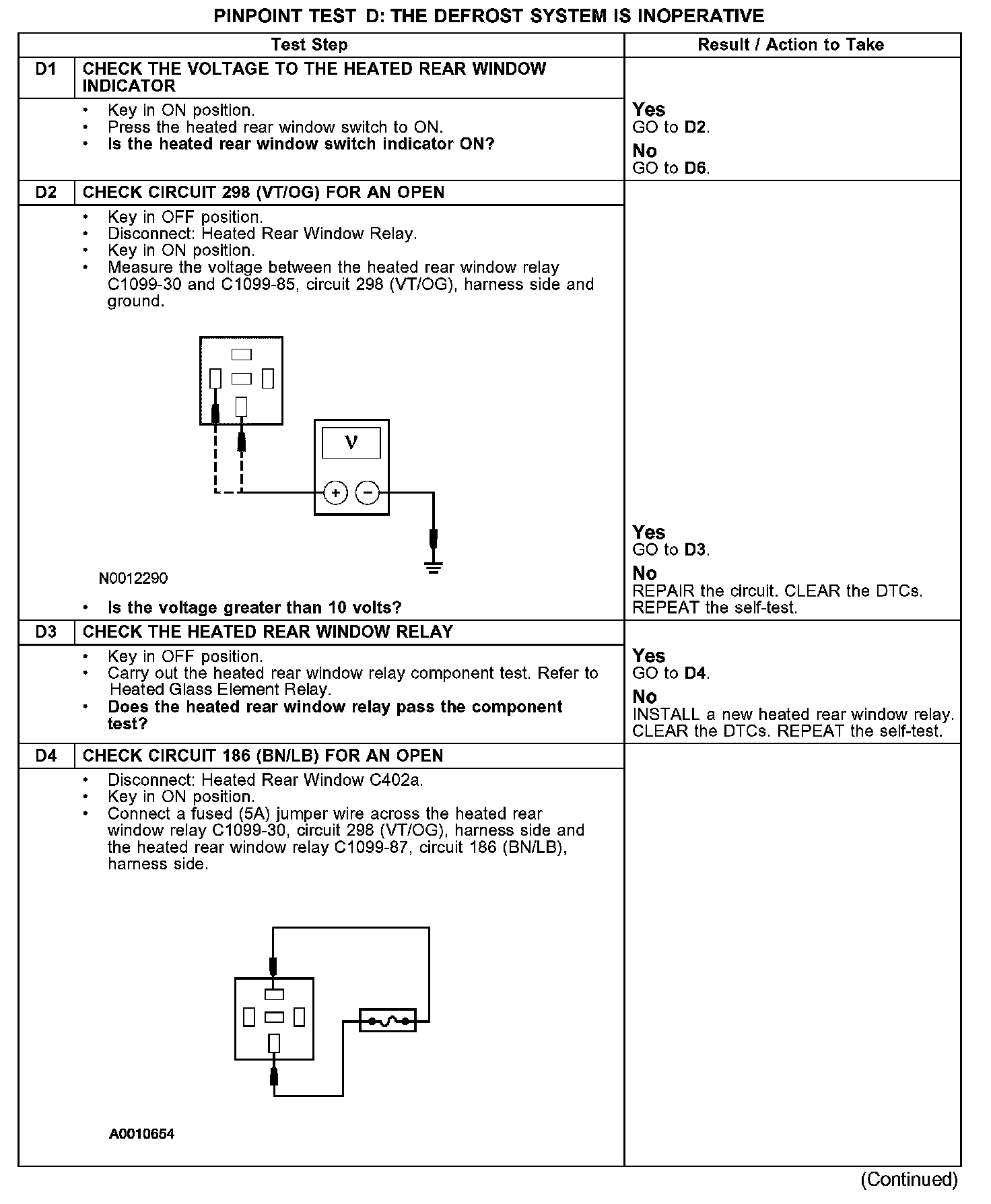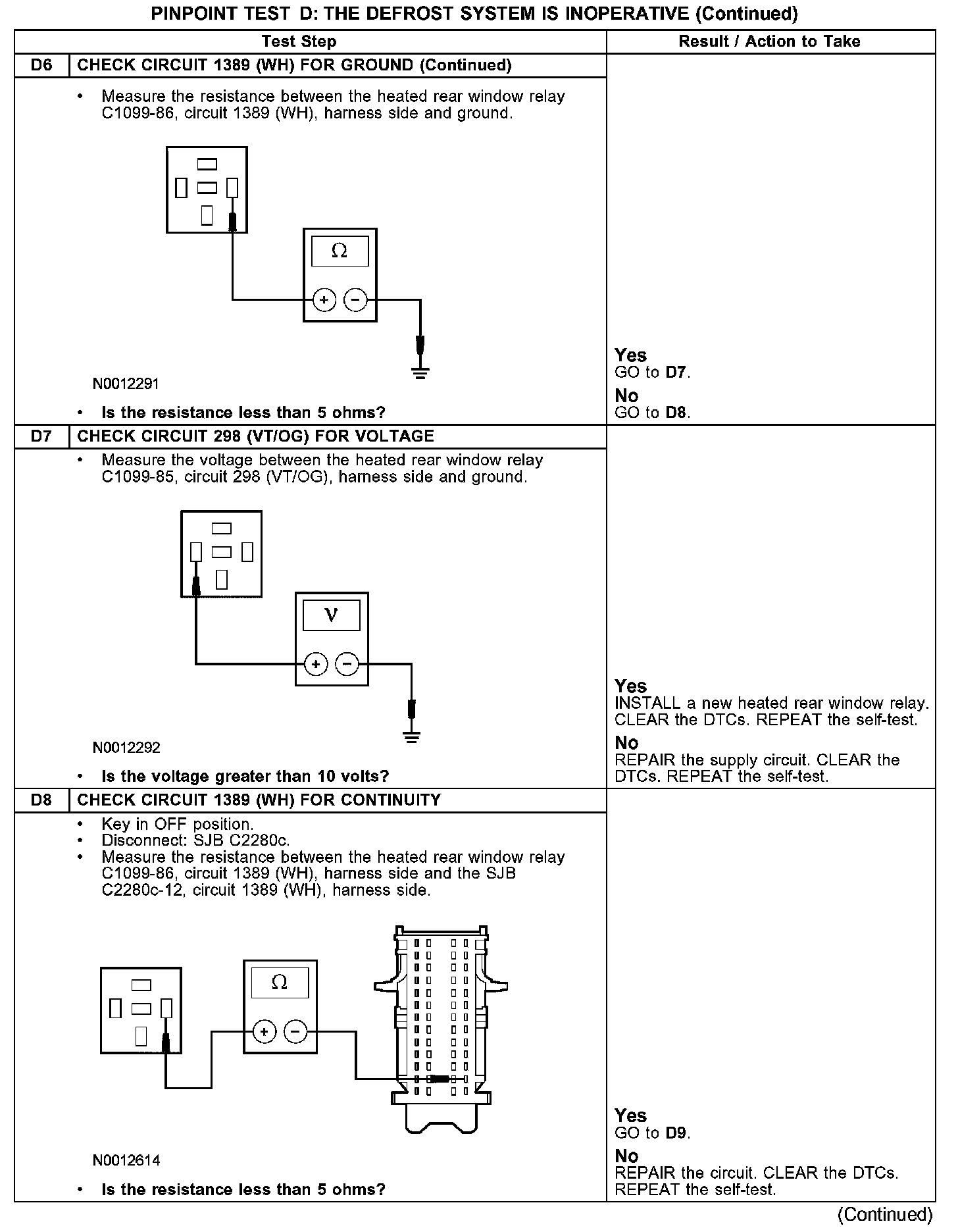 When the rear defrost switch on the electronic manual temperature control (EMTC) module is pressed, a signal is sent to the smart junction box (SJB) to ground circuit 1389 (WH). This closes the heated rear window relay, allowing voltage to be supplied to the heated rear window grid through circuit 186 (BN/LB). The heated rear window grid is grounded by circuit 1205 (BK).