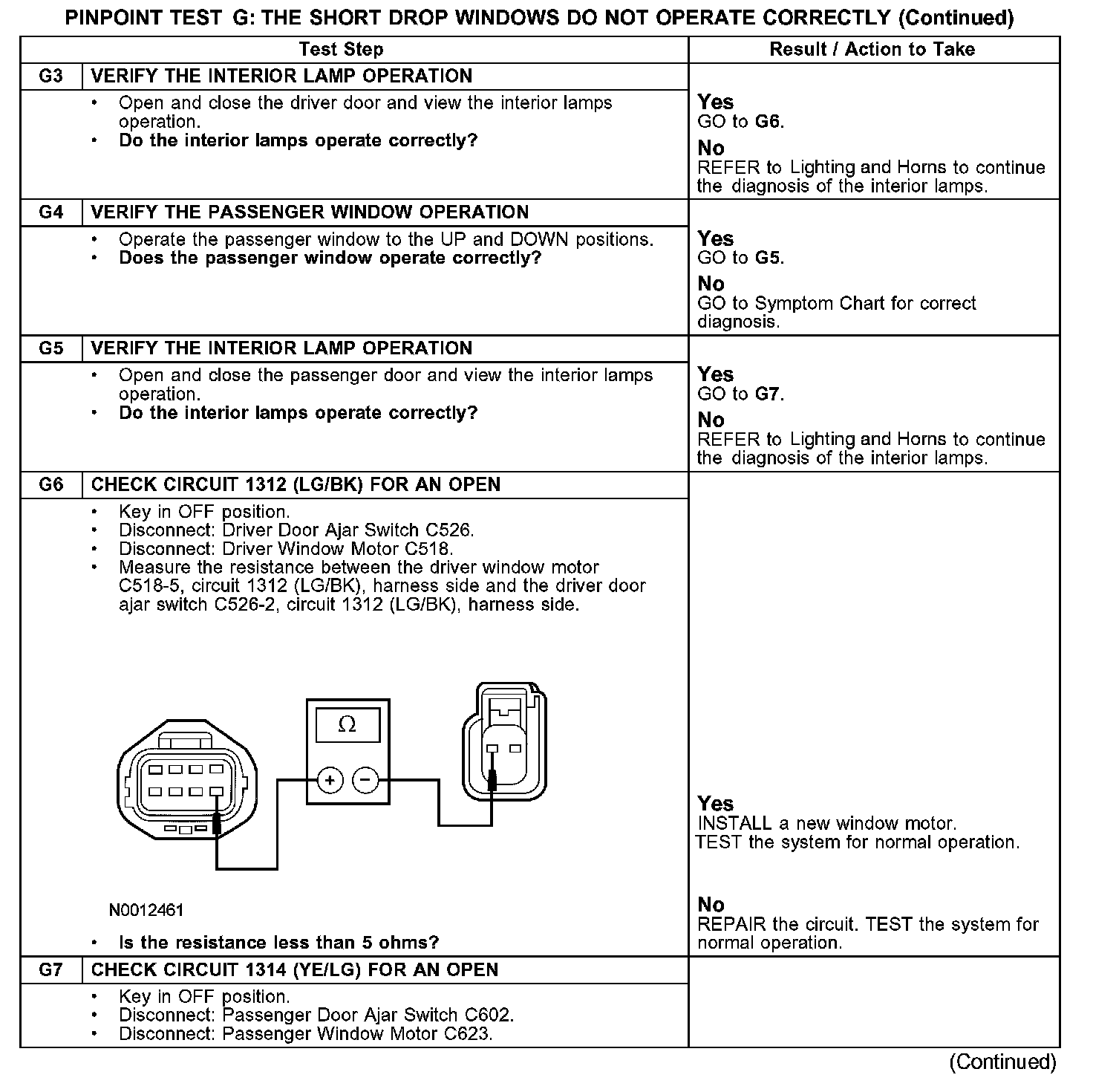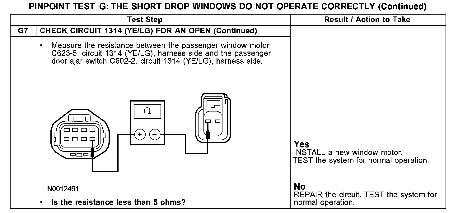 The short drop window feature is activated when one (or both) of the doors are opened which opens a door ajar switch. When a door ajar switch opens, this sends a signal on circuit 1312 (LG/BK) (driver door) or circuit 1314 (YE/LG) (passenger door) to the window motors. The window motors carry out the short drop function.