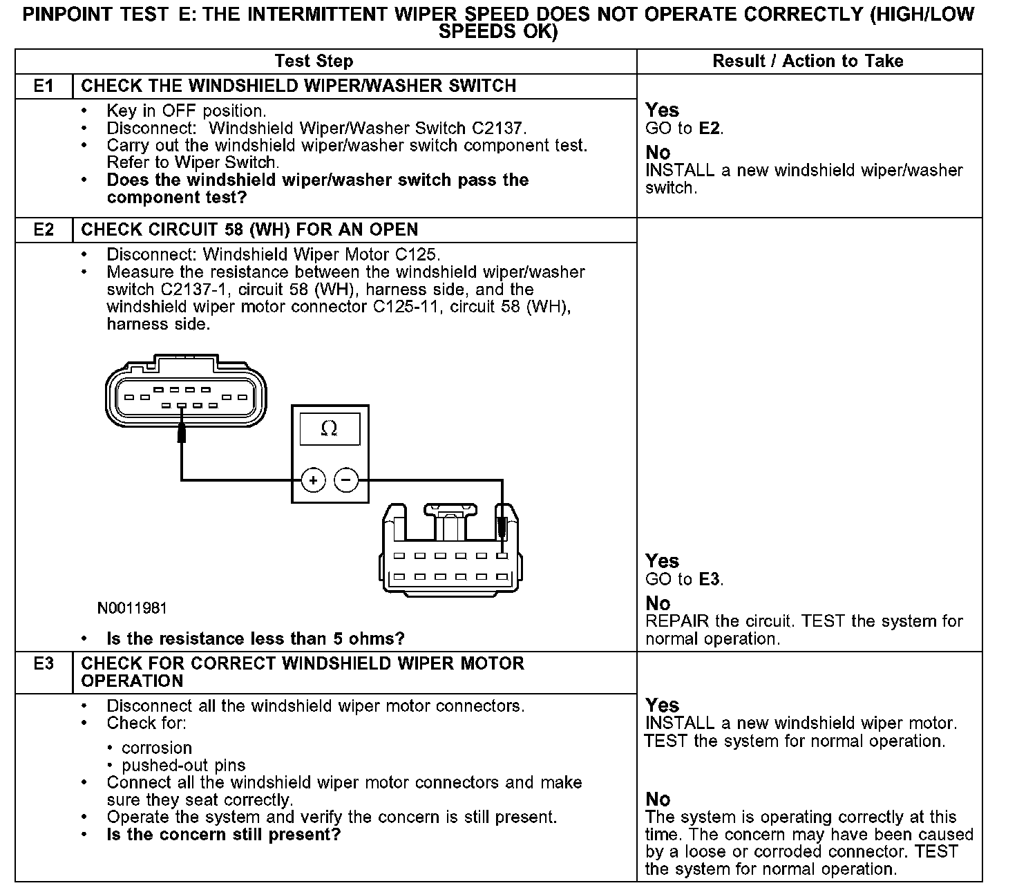 PINPOINT TEST E: THE INTERMITTENT WIPER SPEED DOES NOT OPERATE CORRECTLY (HIGH/LOW SPEEDS OK)E1-E3: