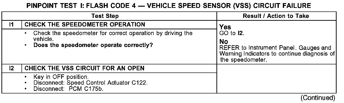 PINPOINT TEST I: FLASH CODE 4 - VEHICLE SPEED SENSOR (VSS) CIRCUIT FAILURE