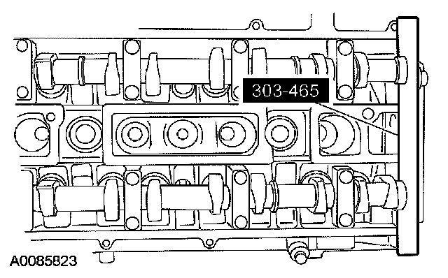 9. CAUTION: The special tool 303-465 is for camshaft alignment only. Using this tool to prevent engine rotation can result in engine damage.