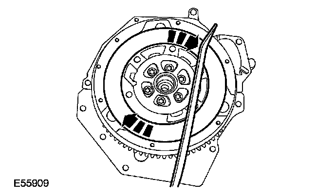 17. Check that the dual mass flywheel friction control plate is centered between the secondary mass notches.