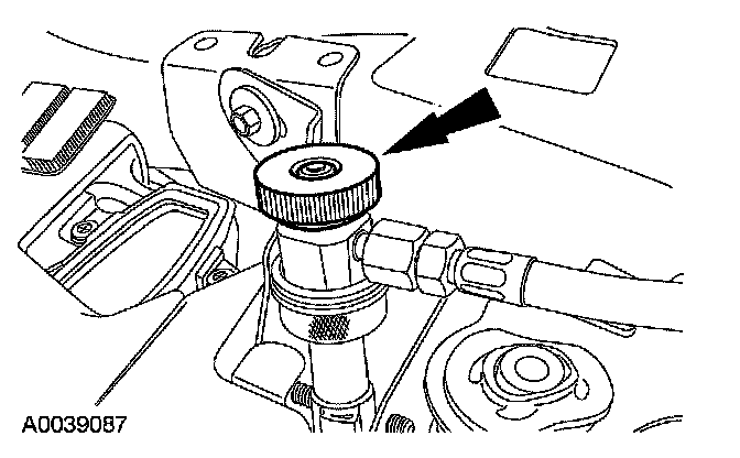 8. Remove the fluorescent dye injector from the low-pressure service gauge port valve and the R-134a A/C refrigerant service center or manifold gauge set.
