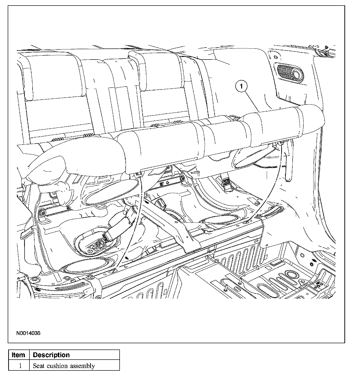 1. From under the front of the rear cushion assembly, push each of the 2 seat cushion release tabs in, lift up at the front and remove the rear cushion assembly.