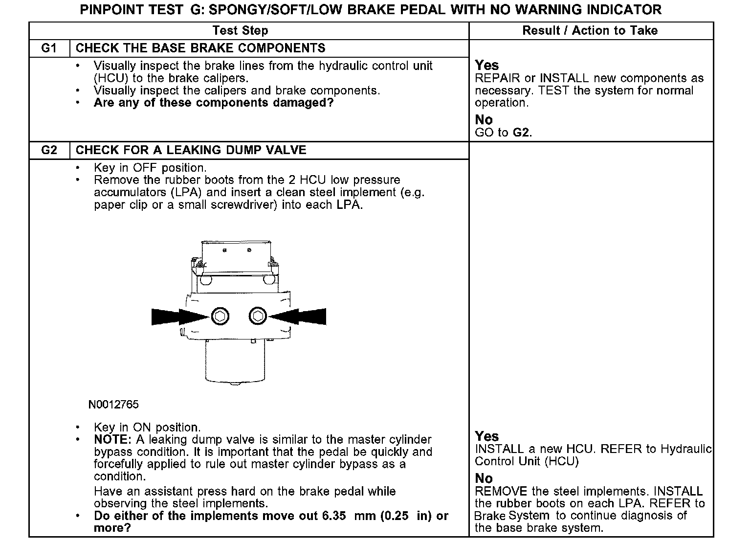 Pinpoint Test G: Spongy/Soft/Low Brake Pedal with No Warning Indicator