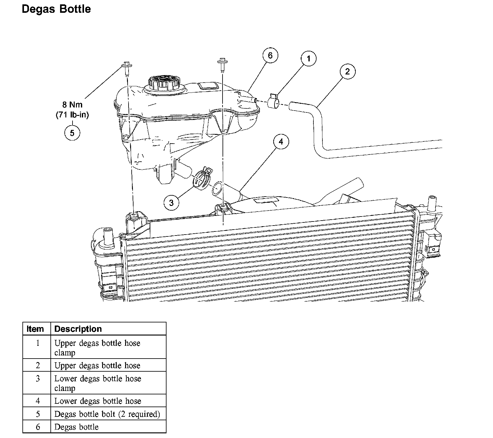 4. Remove the 2 degas bottle bolts and the degas bottle.