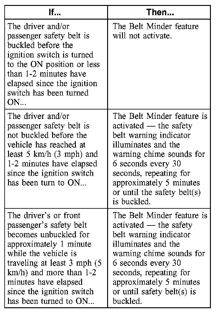 The Belt Minder feature is a supplemental warning to the safety belt warning function. This feature provides an additional reminder to the driver that the driver and/or passenger safety belt is unbuckled by intermittently sounding a chime and illuminating the safety belt warning indicator in the instrument cluster.