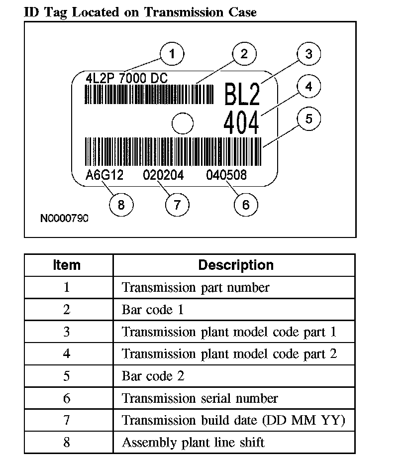 All vehicles are equipped with a Vehicle Certification (VC) label, located on the driver side door lock post. Refer to the code in the space marked TR. For model, service ID level or build date information, refer to the transmission service ID tag located on the transmission case.