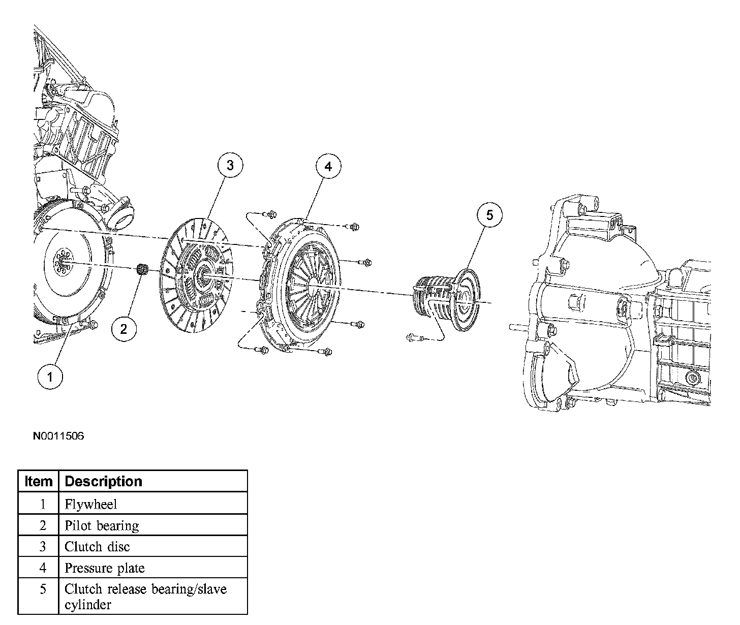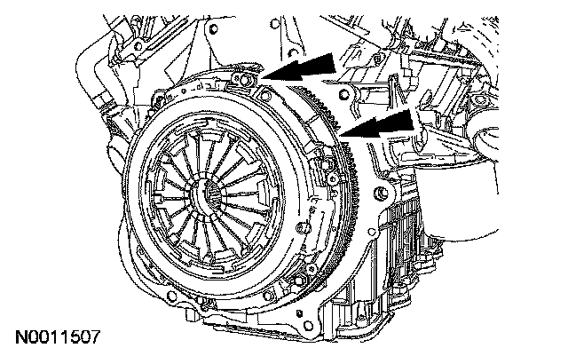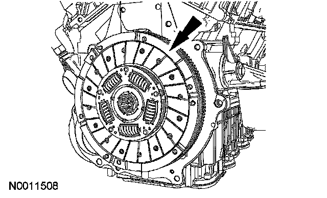 Remove the 6 pressure plate bolts, the pressure plate and the clutch disc. Discard the pressure plate bolts.