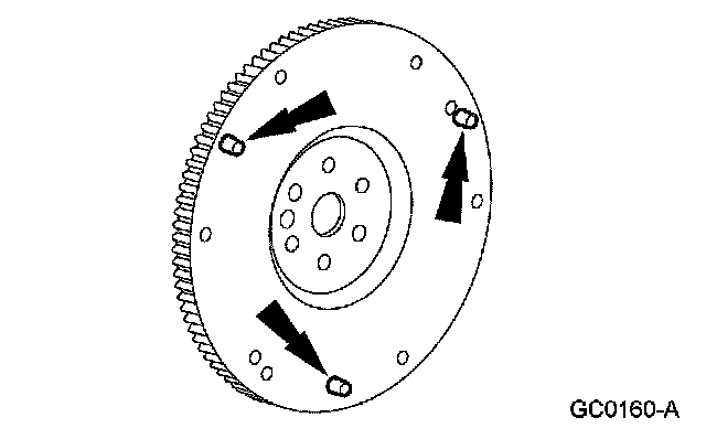 1. NOTE: Take care not to damage the flywheel dowel holes or the surface areas around the flywheel dowel during removal.