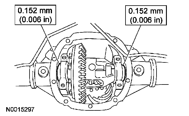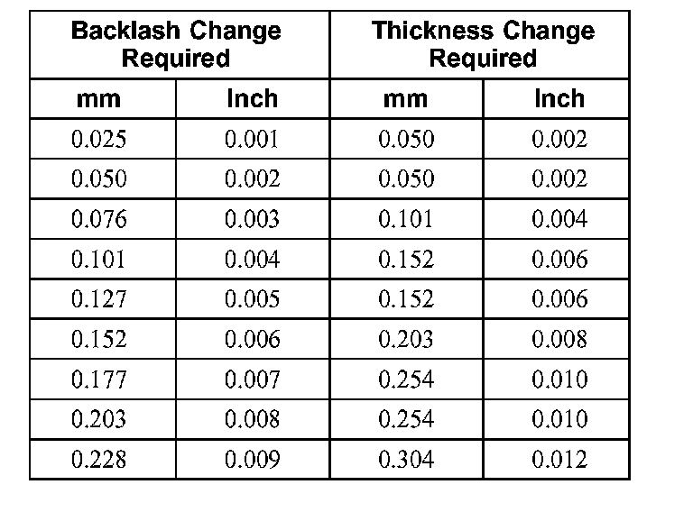 23. If a zero backlash condition occurs, add 0.50 mm (0.020 inches) to the RH side shim and subtract 0.50 mm (0.020 inches) from the LH side shim to allow a backlash indication. Go back to Step 22.