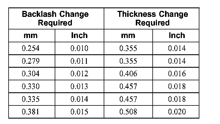 24. To correct for high or low backlash, increase the thickness of one differential bearing shim and decrease the thickness of the other differential bearing shim by the same amount. Refer to the following tables when adjusting the backlash. When the backlash is within specifications, proceed to Step 25.