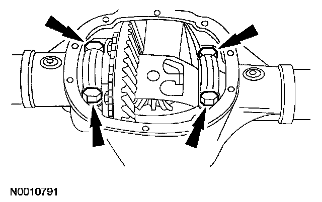 27. Remove the differential bearing cap bolts and differential bearing caps.