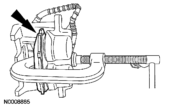 CAUTION: Do not allow the brake caliper, brake pads and anchor plate assembly to hang from the brake hose or damage to the hose can occur.