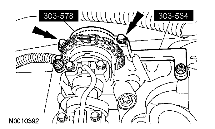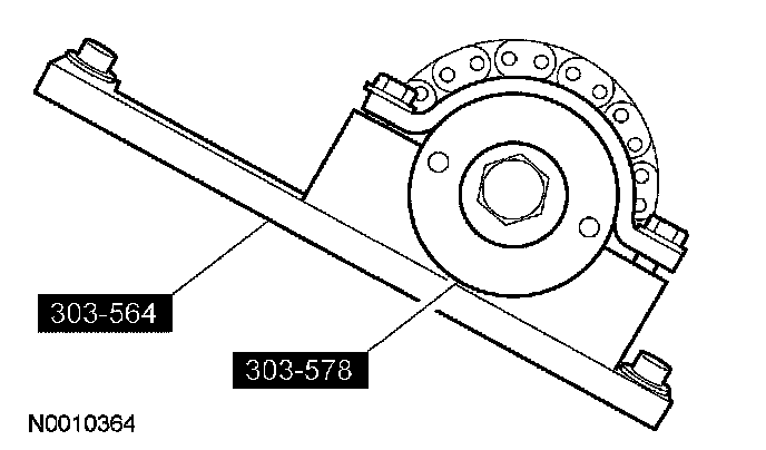 7. Install the special tools on the front of the LH camshaft and tighten the 2 top clamp bolts to 10 Nm (89 inch lbs.).