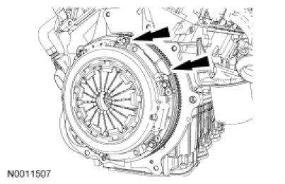 2. Using a suitable clutch aligner, position the clutch disc on the flywheel, then install the pressure plate and 6 new pressure plate bolts.