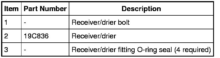 NOTE: Installation of a new receiver/drier is not required when repairing the A/C system, except when there is physical evidence of contamination from a failed A/C compressor or damage to the receiver/drier. Damage to the receiver/drier includes leaks in the receiver/drier, physical damage to the receiver/drier shell or desiccant, or moisture contamination. Moisture contamination results only from a complete loss of refrigerant and equalization of the refrigerant system pressure with atmospheric pressure for a period longer than one hour. If even a slight amount of positive refrigerant pressure is present in the system before repairs are carried out, the receiver/drier should not be replaced.