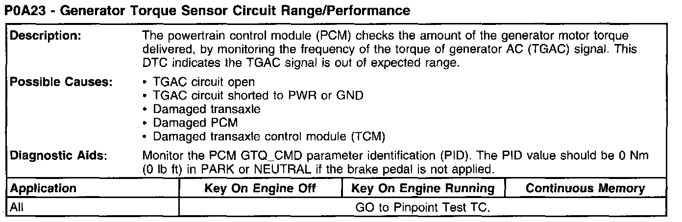 NOTE 4: Clear the transaxle control module (TCM) continuous DTCs. Carry out a TCM key ON engine OFF (KOEO) on demand self-test. If DTC POA92 is present again, check for damaged or seized engine, and install a new transaxle. If the DTC is not present, concern can not be duplicated or identified at this time. Go to PPT Z in Pinpoint Tests for intermittent diagnostics. Test Z: Intermittent