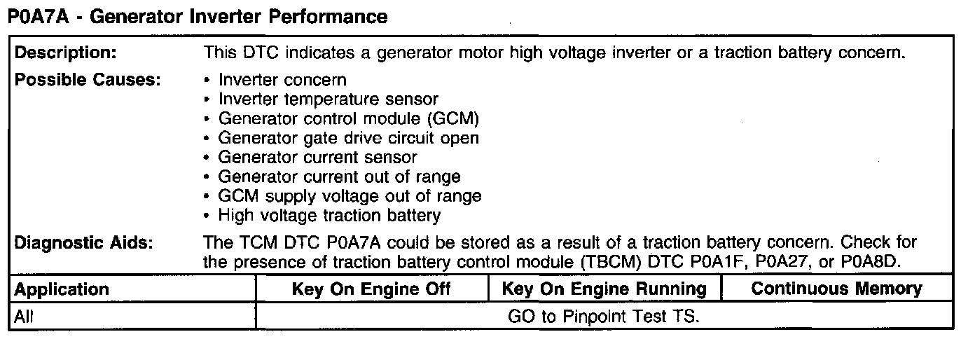 NOTE 4: Clear the transaxle control module (TCM) continuous DTCs. Carry out a TCM key ON engine OFF (KOEO) on demand self-test. If DTC POA92 is present again, check for damaged or seized engine, and install a new transaxle. If the DTC is not present, concern can not be duplicated or identified at this time. Go to PPT Z in Pinpoint Tests for intermittent diagnostics. Test Z: Intermittent