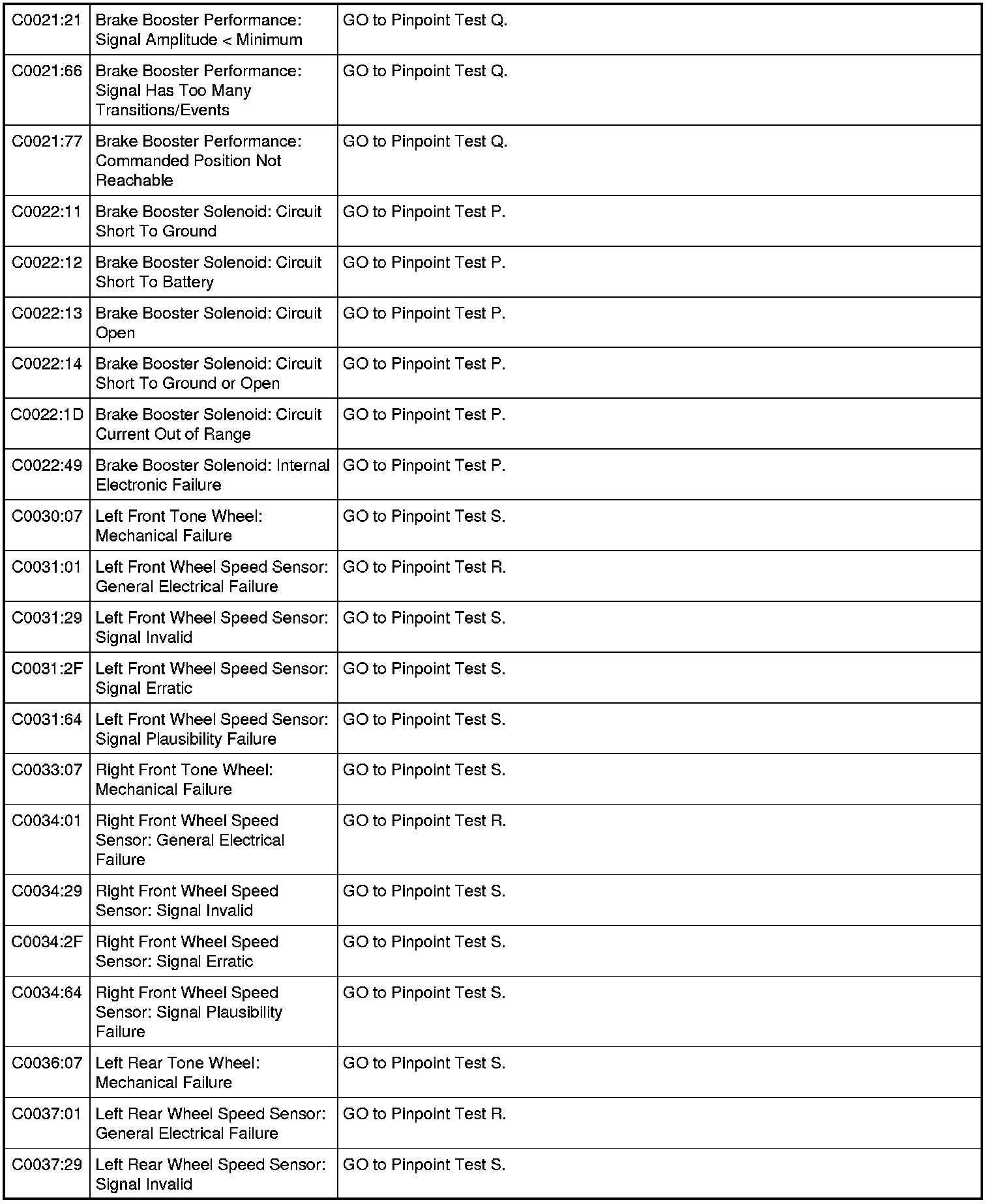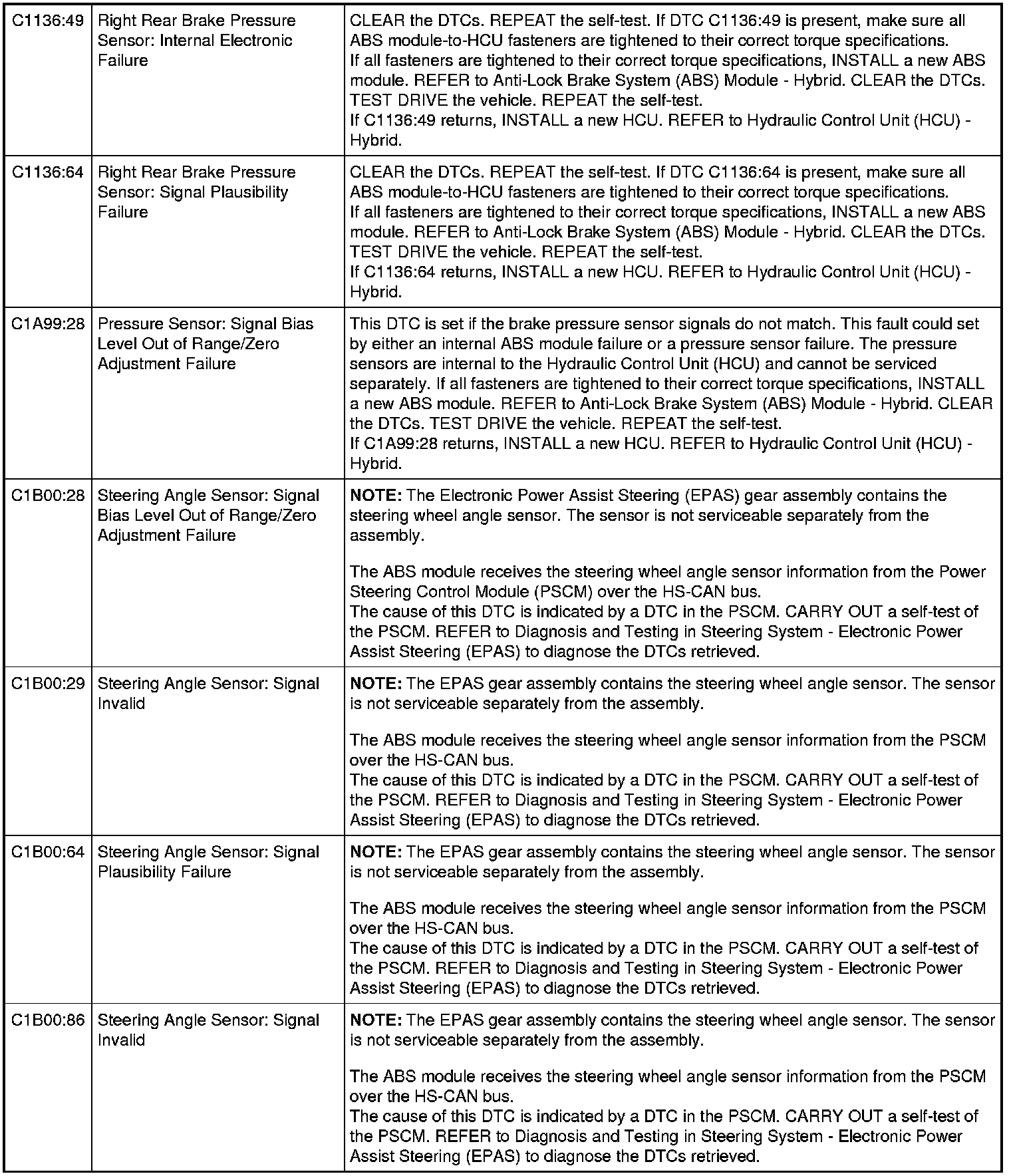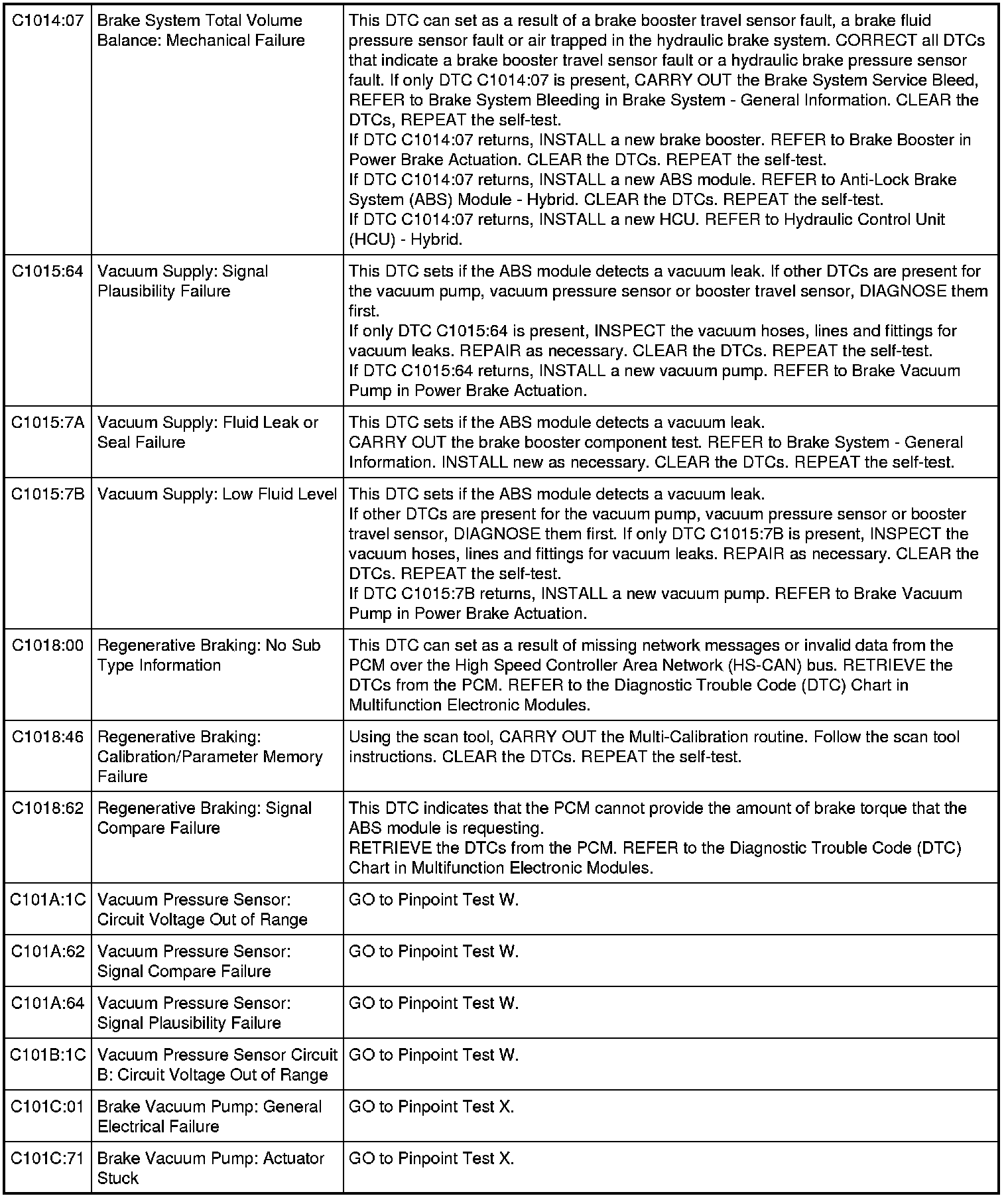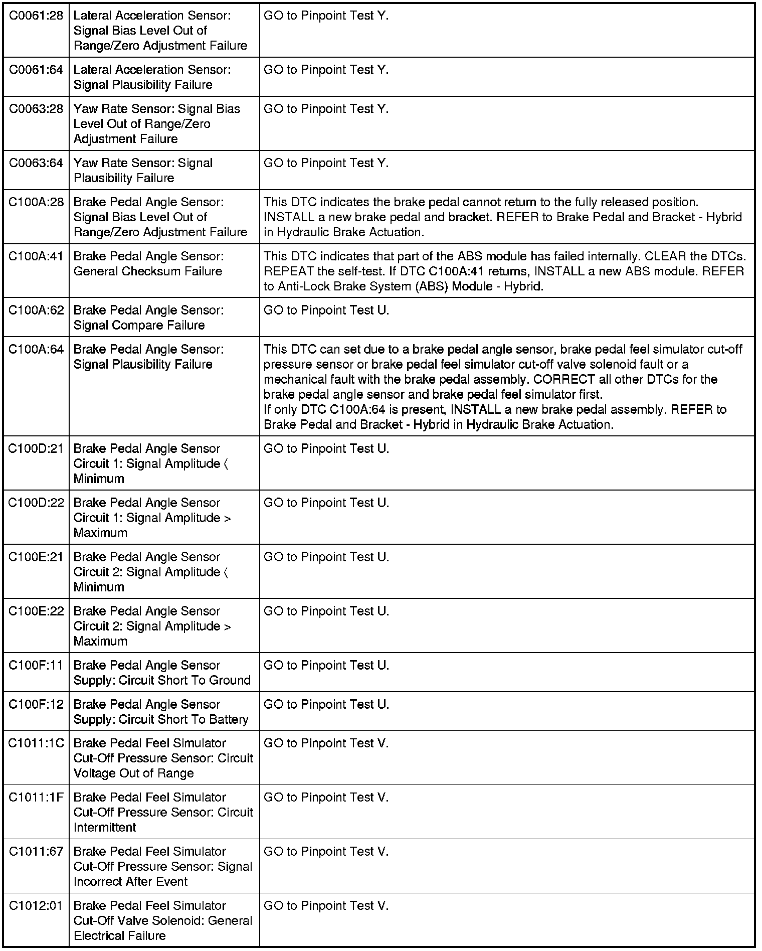 NOTE: This DTC chart applies to hybrid vehicles only. For non-hybrid vehicle DTCs, refer to the ABS Module DTC Chart in Anti-Lock Control - Non-Hybrid.