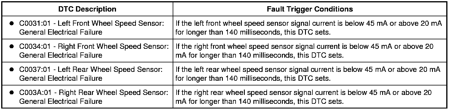 INSPECT the wheel speed sensors, wheel speed sensor wiring and wheel speed sensor tone rings. REPAIR or INSTALL new as necessary. If any other DTCs are retrieved, GO to the ABS Module DTC Chart. ABS Module DTC Chart
