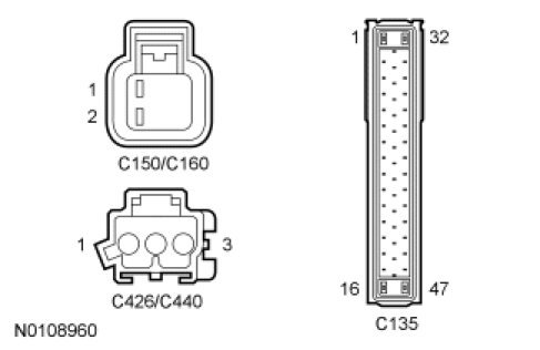 - LR wheel speed sensor C440-3, circuit VCA04 (BU/OG), harness side and LR wheel speed sensor C440-1, circuit RCA18 (BN/GN), harness side.