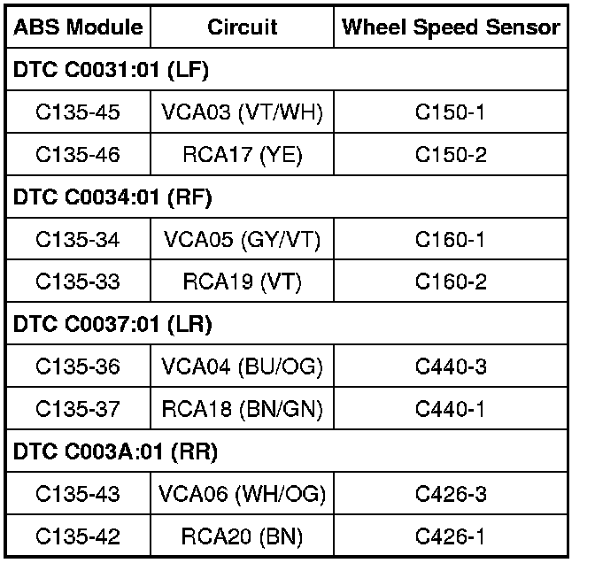 - Measure the resistance between ABS module connector C135, harness side and the suspect wheel speed sensor connector, harness side as indicated in the following chart: