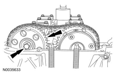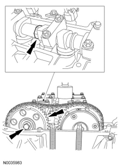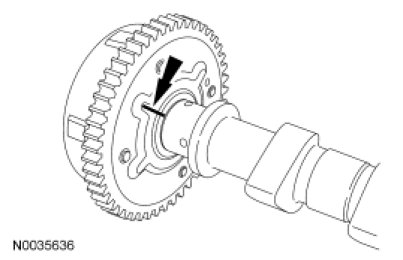 - Align the reference marks on the camshaft phaser and sprocket and the camshaft. Tighten the bolt to 72 Nm (53 lb-ft).